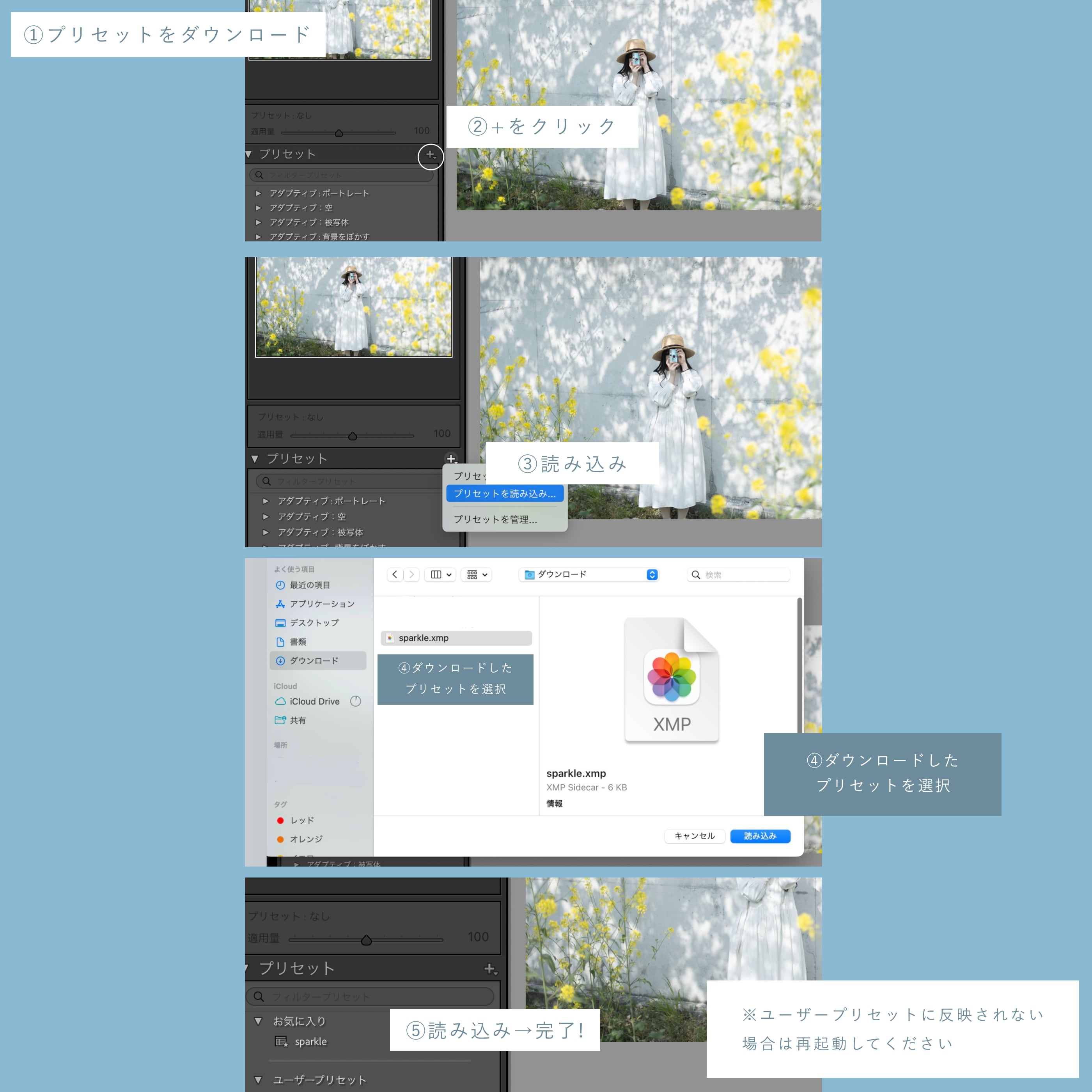 ※2 写真の保存形式はRAWを推奨します。JPEGでも編集は可能ですが、プリセットを当てられても色味がきれいに出ない可能性がございます。